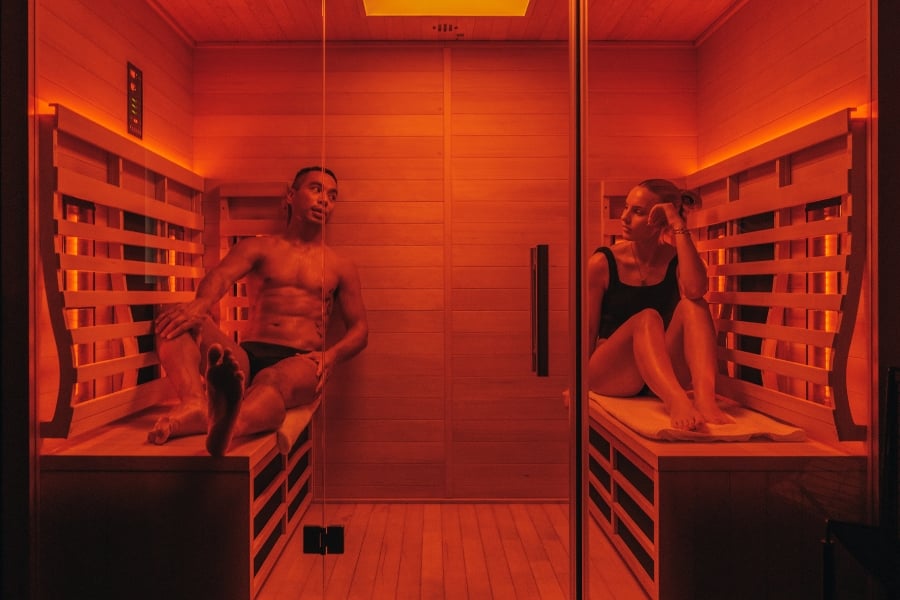 Mat-based workout that blends heat, humidity, weights, and beats for full-body strength and conditioning.