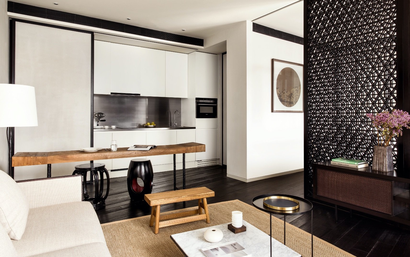 Sophisticated one-bedroom apartment with blend of Italian and Chinese design, generous living space and wood sliding screens.