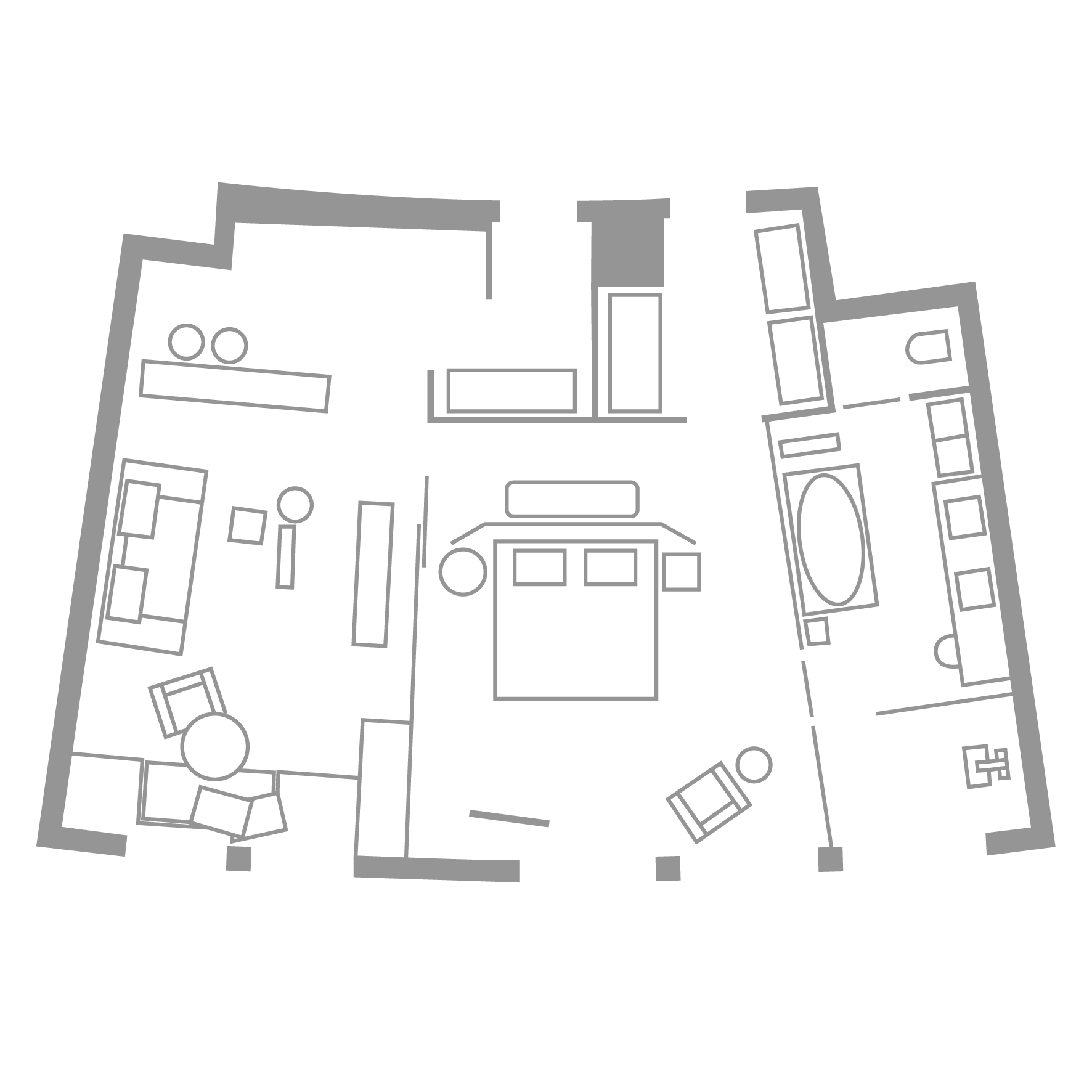 Light-filled with separate living area, luxe standalone bathtub and floor-to-ceiling city views.